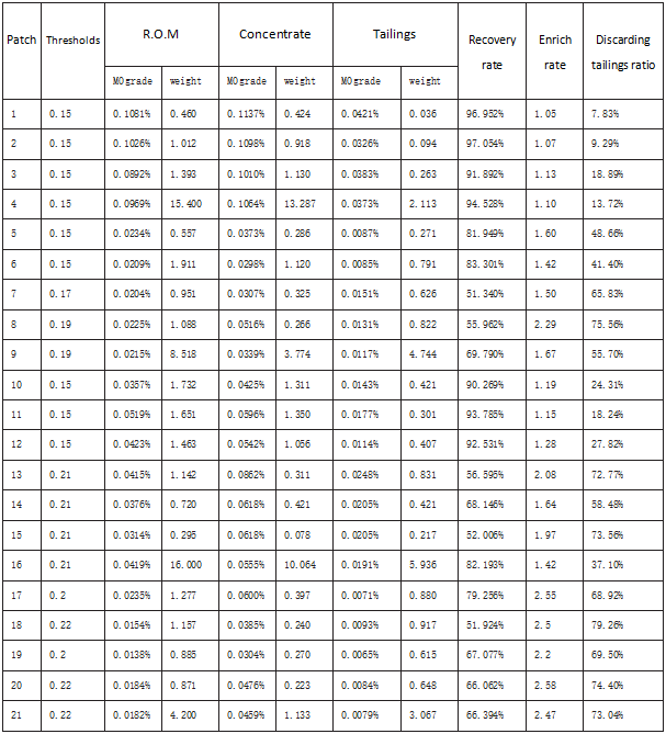 In the test all the lump ore selected at each sampling point can be sorted, and the lump waste rock can be removed from the ore successfully. The MO grade in the tailings can be basically controlled at about 0.03%; after processing the waste by the sorting machine, the MO grade of the lump ore can be increased to more than 0.03%, and if we increase the threshold, the Mo grade of some lump ores can be increased to more than 0.05%. It can be clearly seen form the table below that with the increase of the threshold value, the grade of concentrate is obviously improved, the discarding tailings ratio is also significantly increased, and the enrichment ratio is also improved.